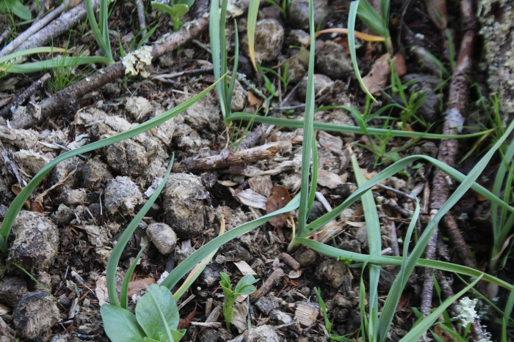 I have a garlic bed. I put a lot of ideas in this one bed. Lots of sticks, soil and horse dung. Then I added leftover fava beans and am encouraging one dandelion to grow. It is my random guild (companion planting).
