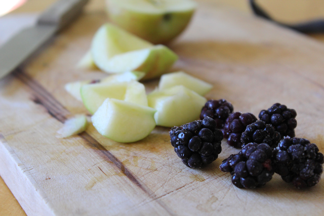 - Place apples and blackberries in slow cooker on low. You can fill it up to overflowing as long as the lid fits on there. (I have a very small 12 cup cooker, so you can do a lot more with a bigger one – just make sure it is about 2/3 blackberry to 1/3 apple ratio).